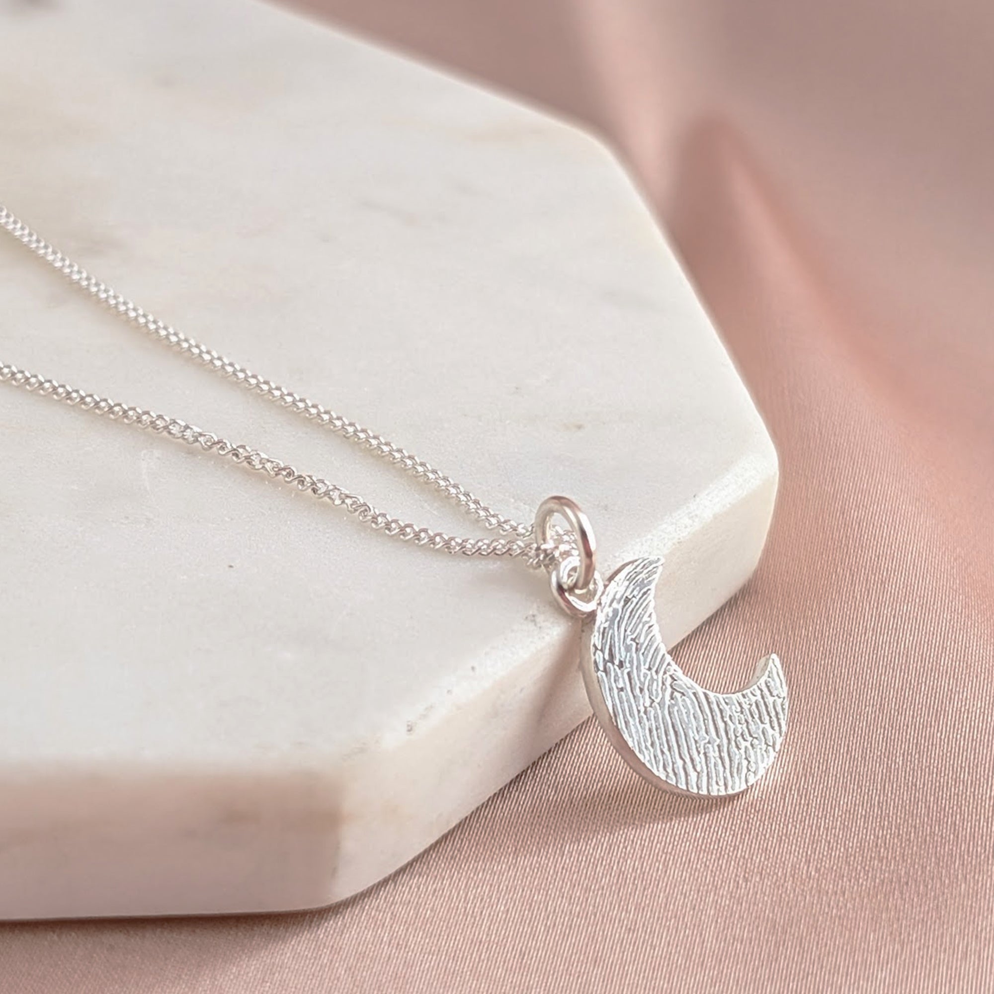 Each charm is individually made to order and engraved with your loved one’s unique fingerprint, carefully captured on the front of the crescent moon. On the reverse, you can add a personal touch with a name, special date, or short message, making every piece a truly one-of-a-kind treasure.