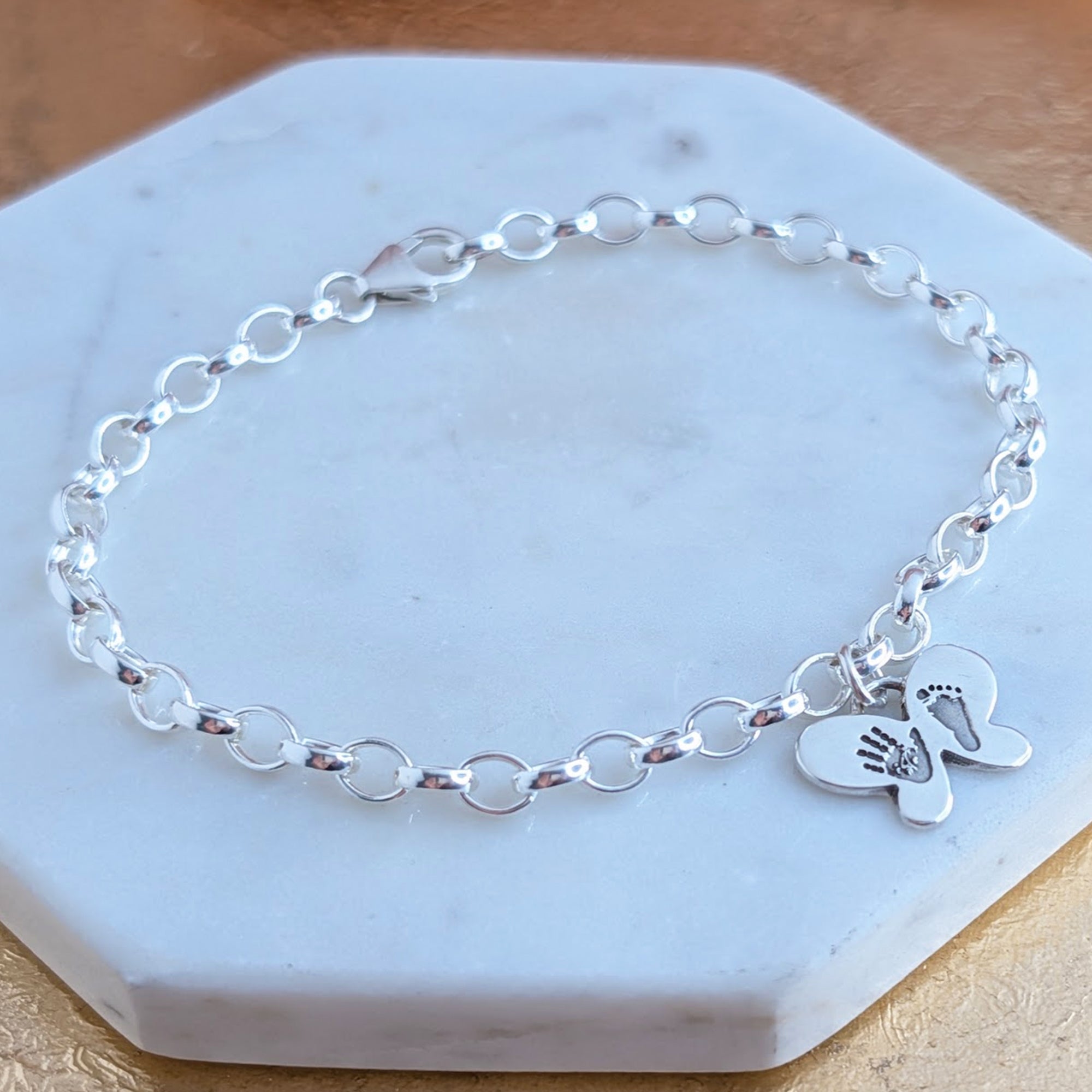 Perfect for Mum, the Little Luxuries Handprint or Footprint Charm bracelet is a timeless way to wear her babies print. Handmade from sterling silver, the charm preserves your little one’s hand or footprint in delicate detail, turning a moment of childhood into something tangible to cherish. The bracelet is a classic oval belcher chain, fastening with a secure clasp.