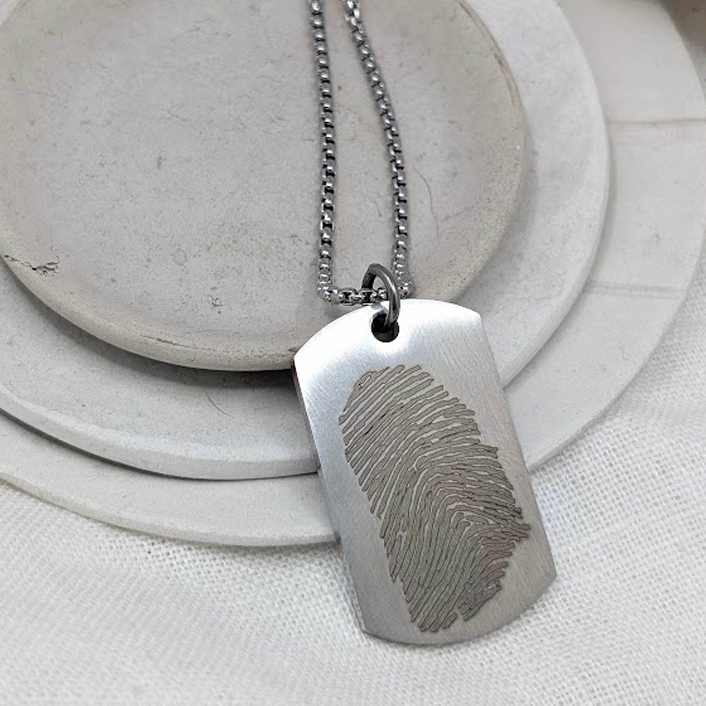 Featuring your unique loved ones fingerprint and even their handwriting. The perfect everyday necklace for active lives with all the poignancy of our precious metal pieces but with the extra strength and durability of Stainless Steel to wear anywhere anytime.