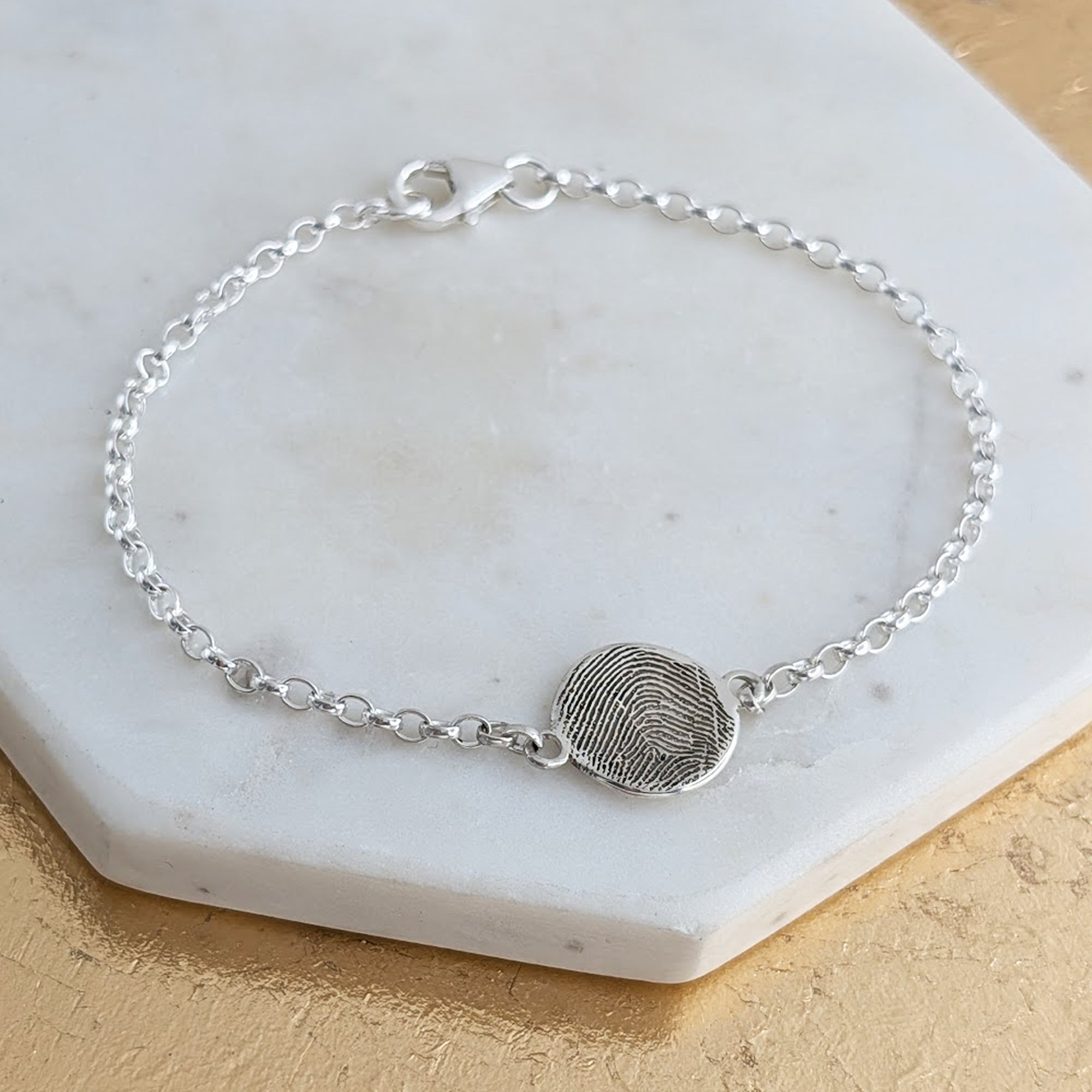 Each bracelet is individually made to order, ensuring no two are ever identical. The organic form, combined with your unique fingerprint engraving, transforms a simple chain bracelet into a custom keepsake.