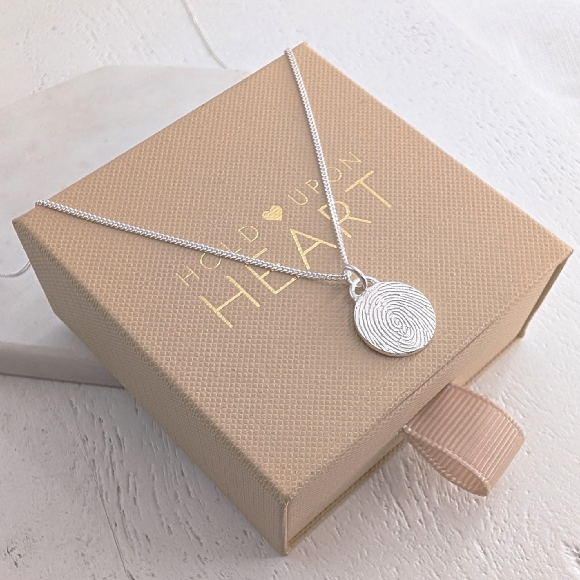 Handcrafted in our Shropshire studio from your choice of sterling silver or solid gold, the Dainty Disc Fingerprint Charm is a beautifully understated way to carry someone special with you. Thoughtfully designed to be small, light, and easy to wear every day, it offers the sentiment of fine jewellery at an afforable price.