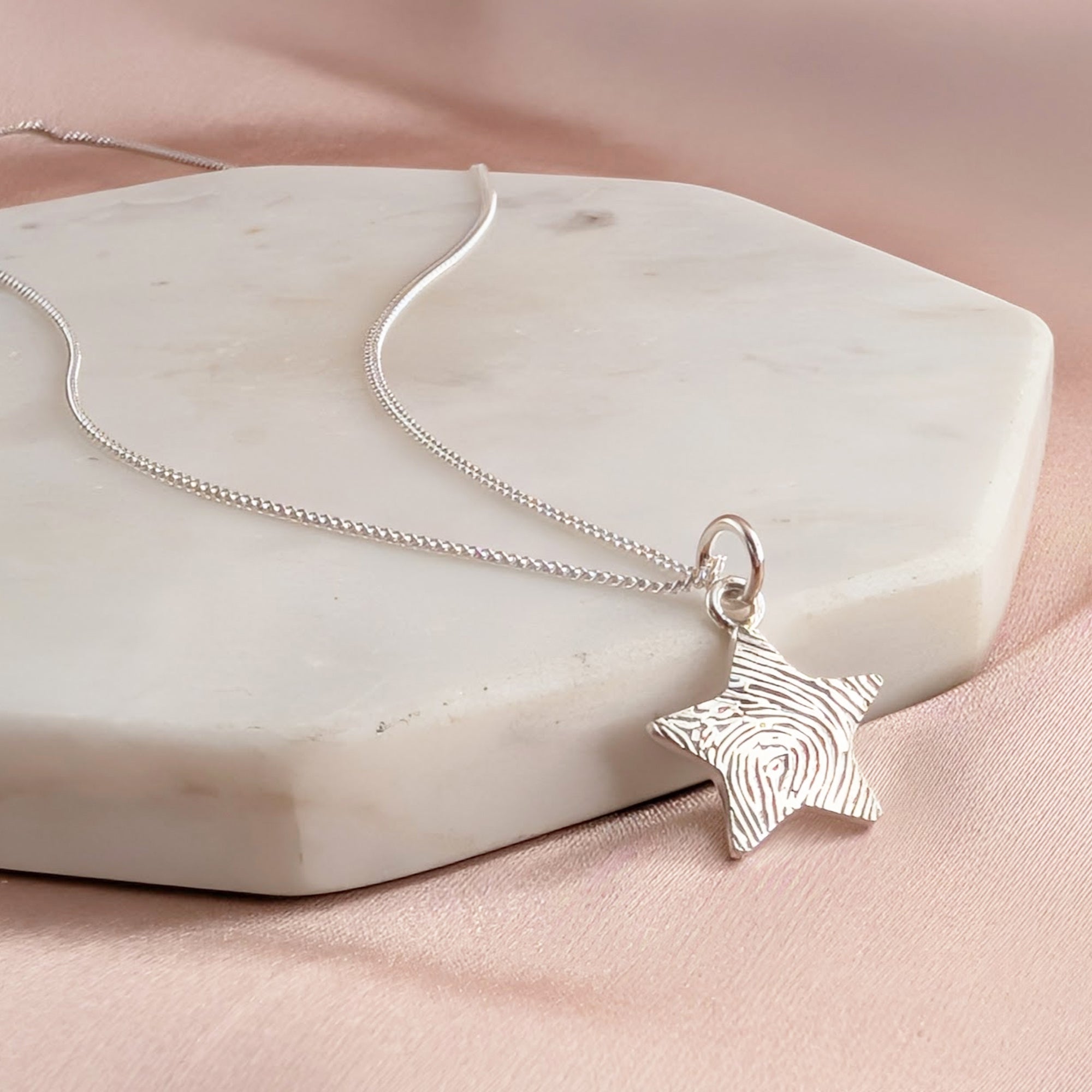 A delicate symbol of love and connection, the Star Fingerprint Charm is thoughtfully crafted in sterling silver or solid gold. Lightweight and comfortable for everyday wear, its timeless star shape makes it a subtle yet meaningful keepsake to treasure for years to come.