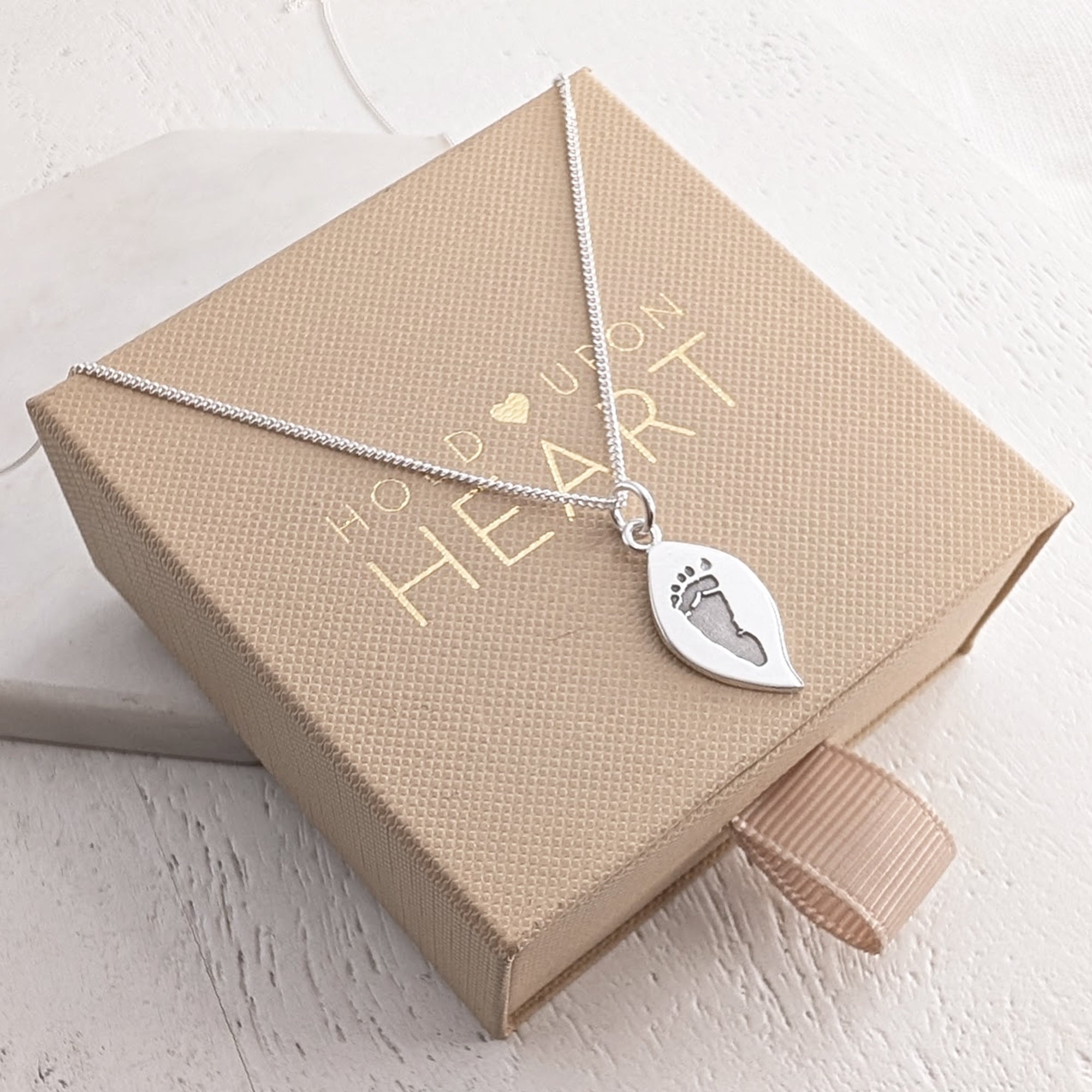 This beautiful leaf charm holds your baby’s tiny hand or footprint in delicate detail — a keepsake inspired by the most natural of loves.