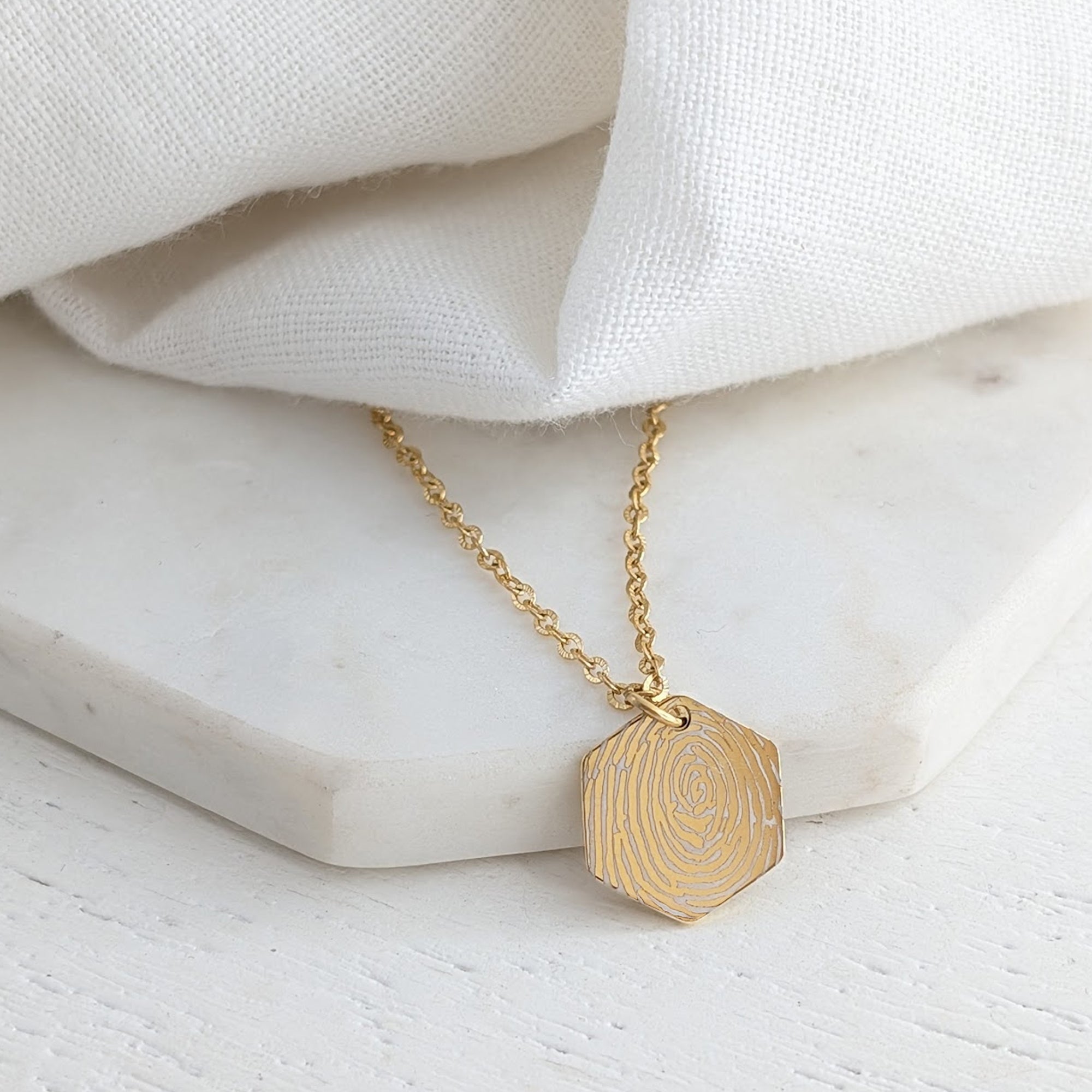 This beautiful stainless steel hexagon charm necklace can be custom engraved with your loved one's unique fingerprint, creating a deeply personal keepsake that captures a loved ones touch forever.