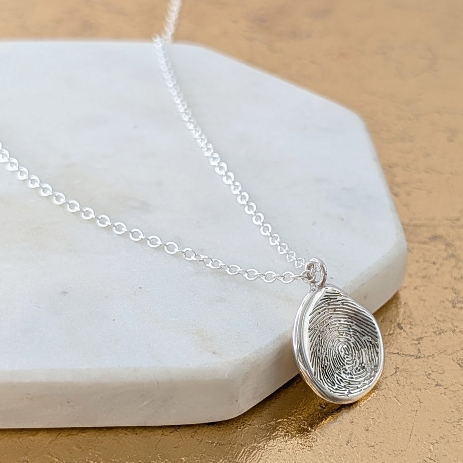 Fingerprint jewellery is a way of preserving the unique fingerprint of a loved one on a piece of jewellery you can wear and treasure. Using an existing fingerprint, or one created especially, we carefully transfer the fine lines and details into silver and gold, creating something truly one of a kind.