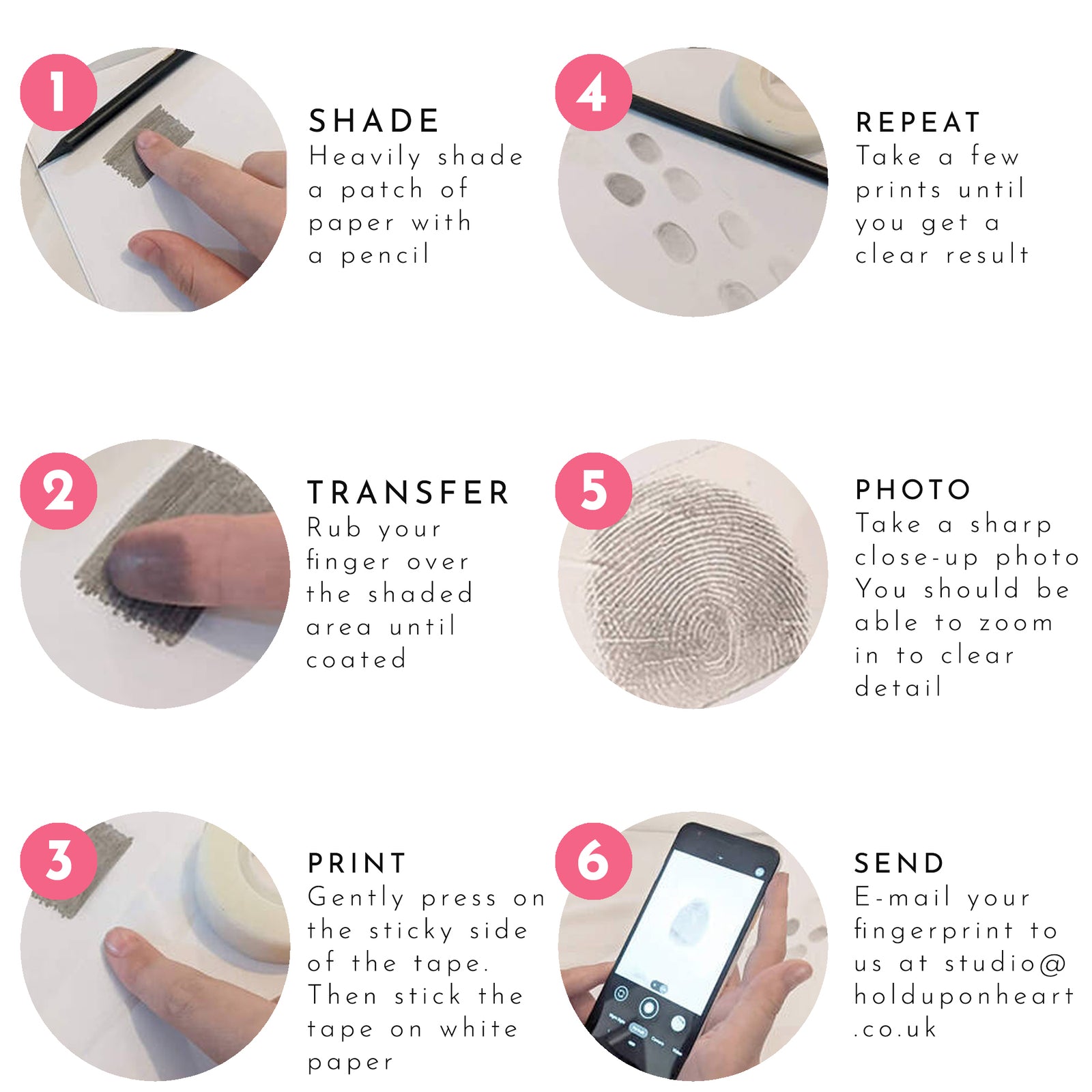 You can send us a photo of an existing fingerprint (from ink, pencil, or digital image), or you can follow our instructions below to capture a new fingerprint in pencil at home. We’ve been working with fingerprint for a long time, and are able to work with most prints, but will let you know if we need a clearer image.